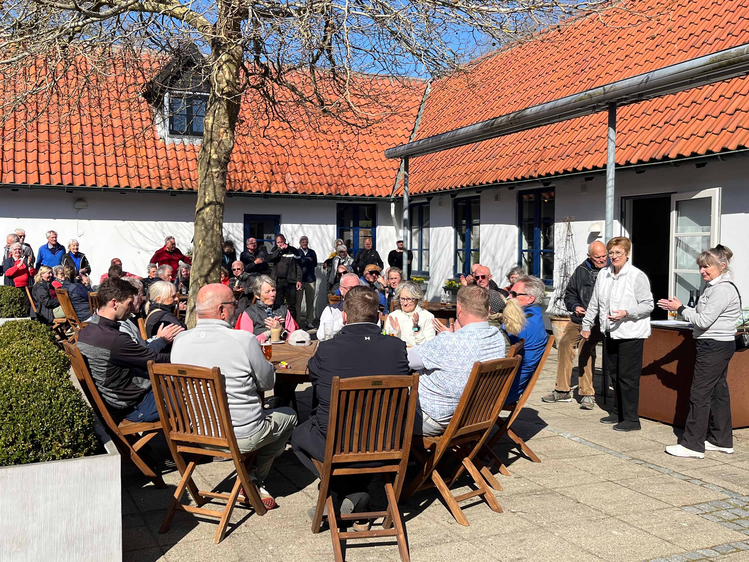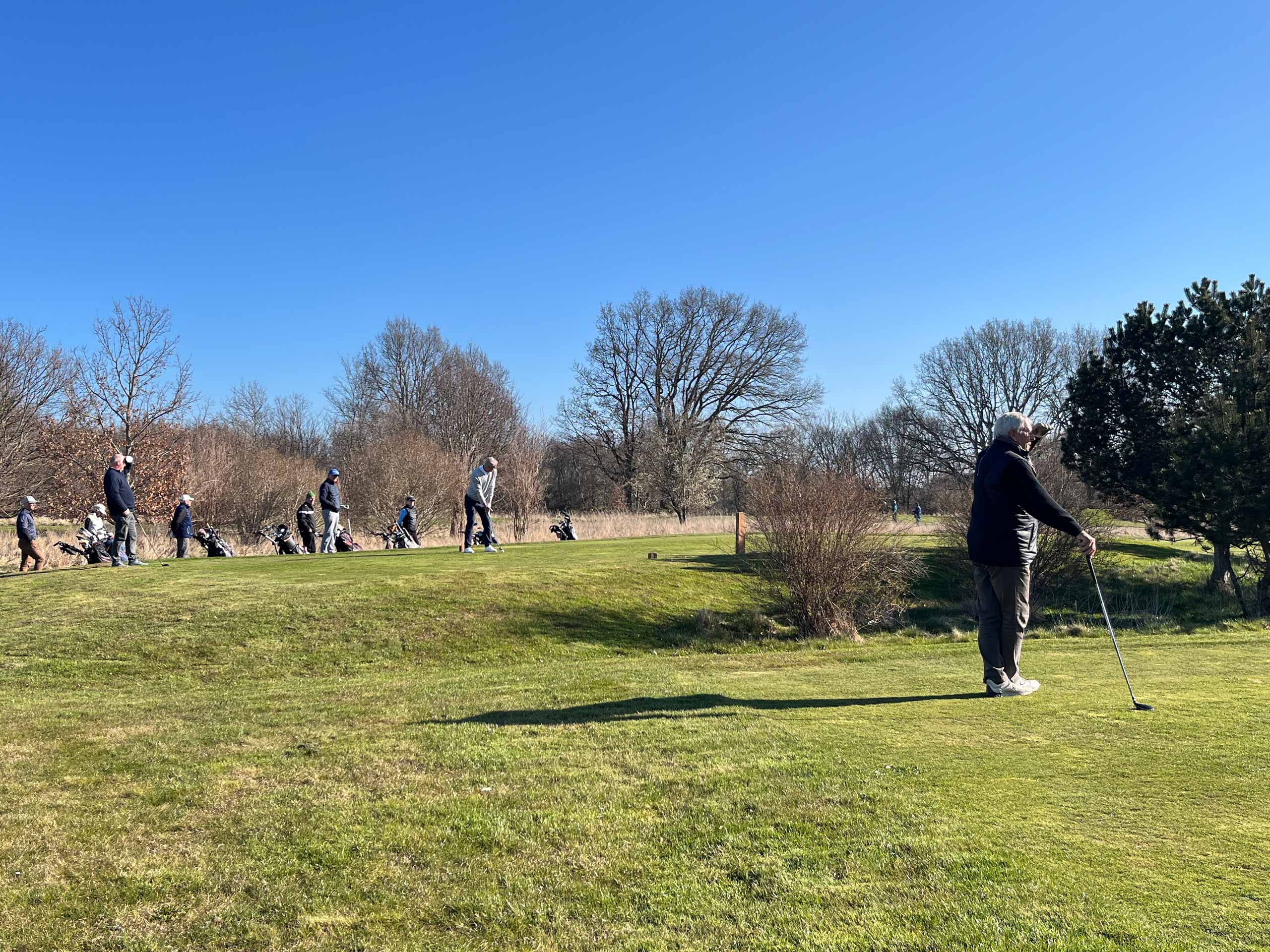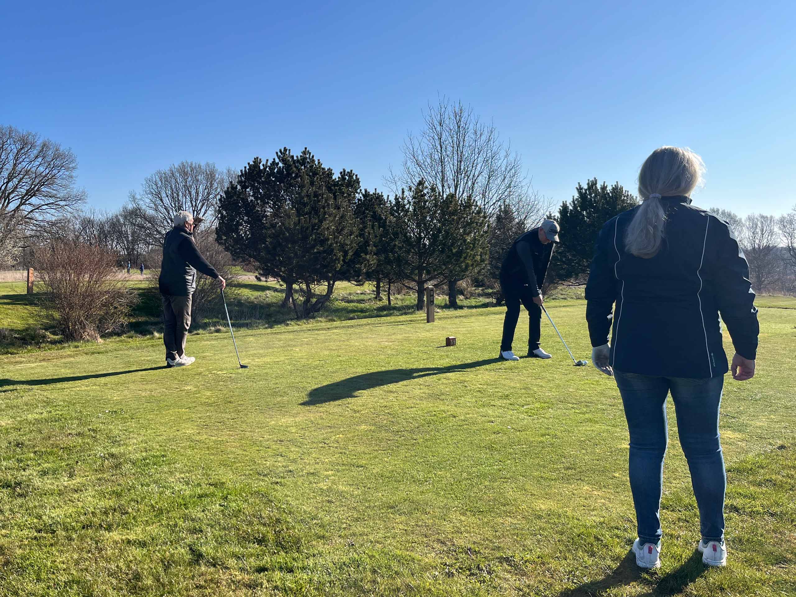 Efter morgenmad og med en halv times tidsforskydning (pga. eventuel morgenfrost), var alle ude på deres respektive huller til gunstart. Holdspil, med de 3 bedste scores som tællende. Solrigt, men fortsat et noget køligt aprilsvejr. Mange havde det dog fint med at være ude i atriumgården.