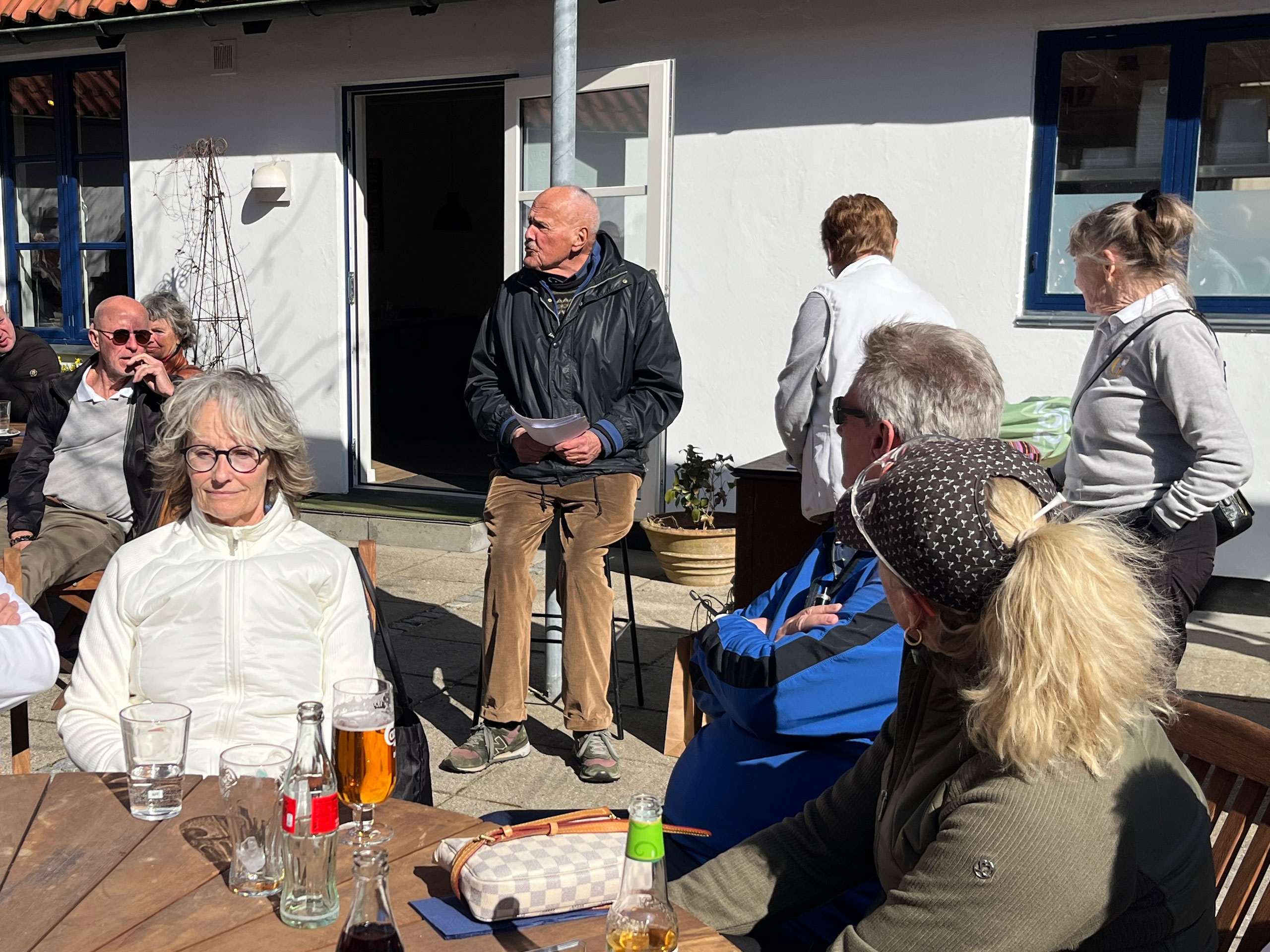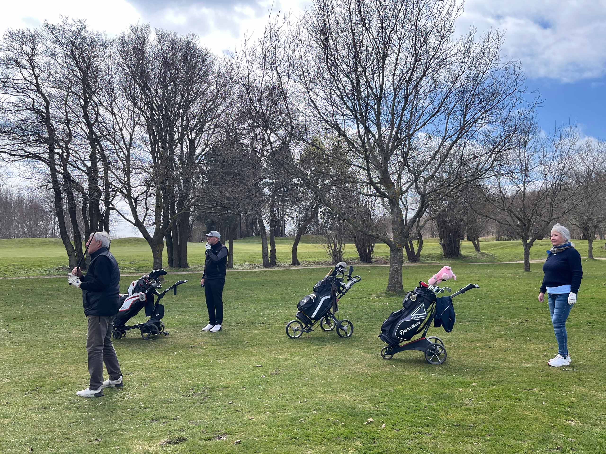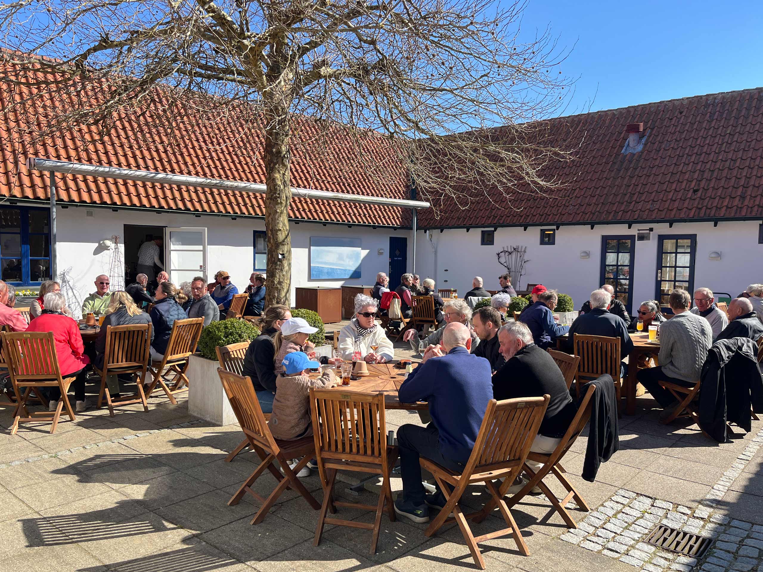 Efter morgenmad og med en halv times tidsforskydning (pga. eventuel morgenfrost), var alle ude på deres respektive huller til gunstart. Holdspil, med de 3 bedste scores som tællende. Solrigt, men fortsat et noget køligt aprilsvejr. Mange havde det dog fint med at være ude i atriumgården.